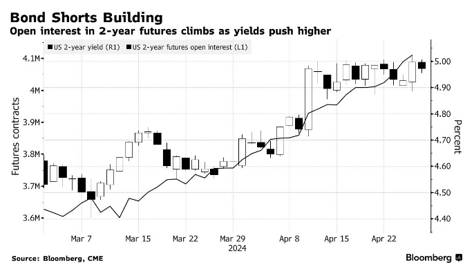 新资金正在进入收益率上升的交易,随着期货的抛售,空头头寸不断增加。这在收益率曲线的前部和腹部表现得最为明显,在过去22个交易日中,两年期国债期货的未平仓合约有21个交易日上升。美国两年期国债收益率上周四达到5.025%的峰值,这是自去年11月以来的最高水平,因交易员削减了今年及以后的降息预期。