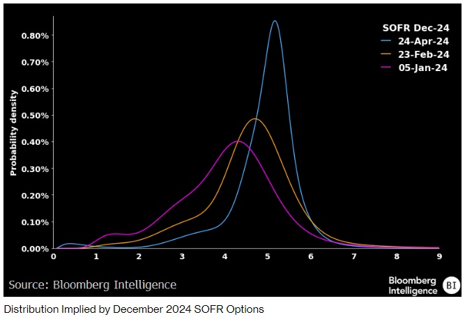 最近的通胀数据仍强于预期,降低了市场对美联储将在近期降息的预期。尽管上周随着收益率突破年内新高,美国国债期货的空头头寸有所增加,但期权流动暗示,围绕美联储今年货币政策走向的不确定性日益增加,这导致多个期限的深度价外尾部风险对冲工具出现。