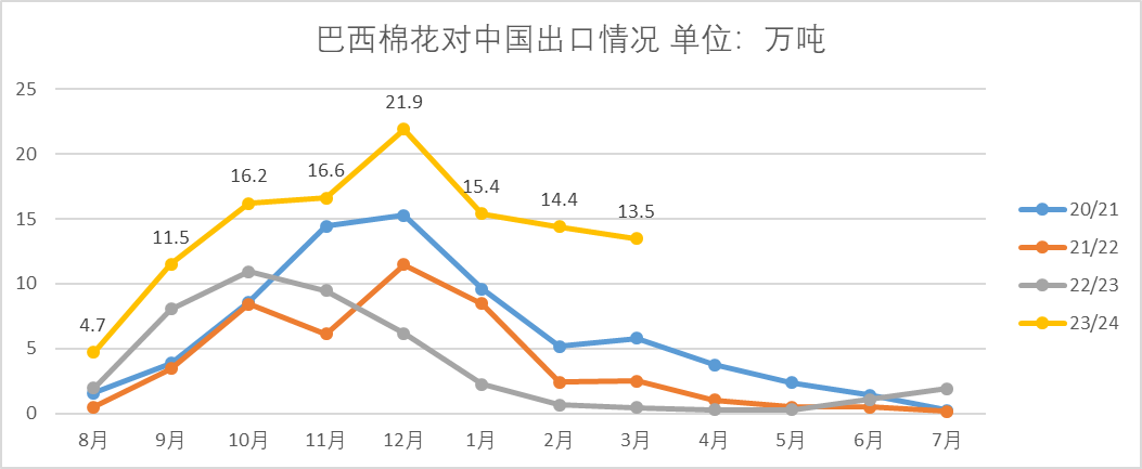 据巴西国家商品供应公司(CONAB)4月份发布的2023/24年度最新产量预测数据,本年度巴西棉花总产预期为360万吨,较上月调增3.99万吨,产量继续创纪录,22/23年度巴西的产量为317万吨。巴西出口也随着产量增加而水涨船高,中国是巴西棉花的出口目的地。巴西3月份出口为25.3万吨,中国进口量为13.5万吨;从23年8月份至24年3月份,中国累积进口巴西棉花114.2万吨。