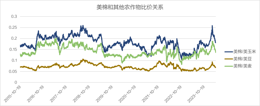 回顾近几年种植意向报告的面积和最终种植面积出入一直比较大,偏差幅度有可能在10%左右,从目前的比较关系来看,相对其他农作物,美棉种植仍处于偏好的状态,对于美棉的种植面积仍要看6月种植面积报告。