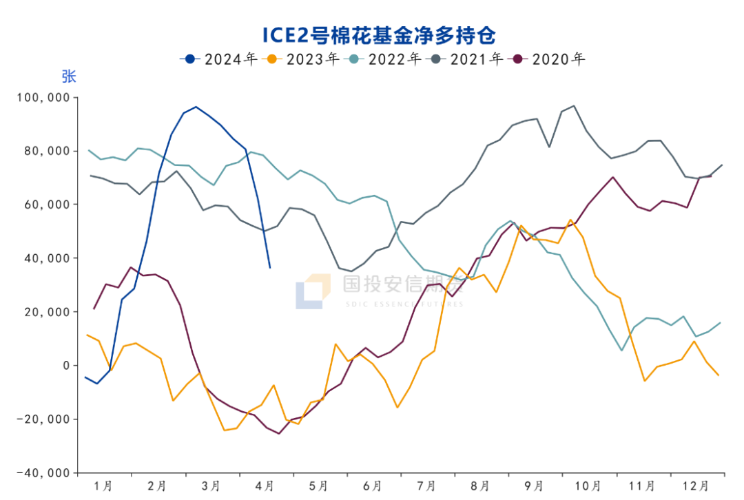 但从3月初开始,美棉先是维持高位震荡,随后价格连续大幅下跌,美棉指数更是直接跌破了80美分,基本回到了此前上涨行情的起点位置。美棉的基金净多持仓开始从高位连续回落,美棉的仓单从3月开始快速增加,已经来到了五年高位,美棉由于库存偏紧所带来的逼仓风险大幅降低。市场关注的焦点逐渐向新年度种植、天气,目前美棉种植进度正常,24/25年度增产是大概率时间,只是增多少的问题。