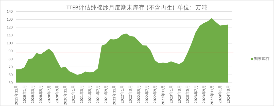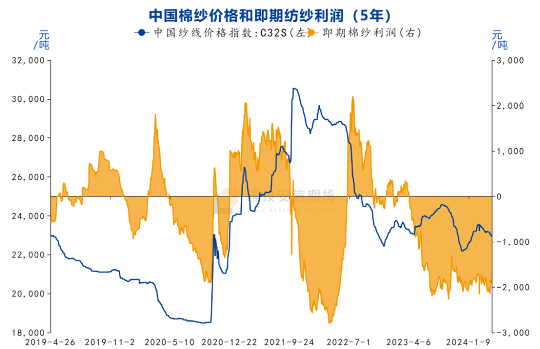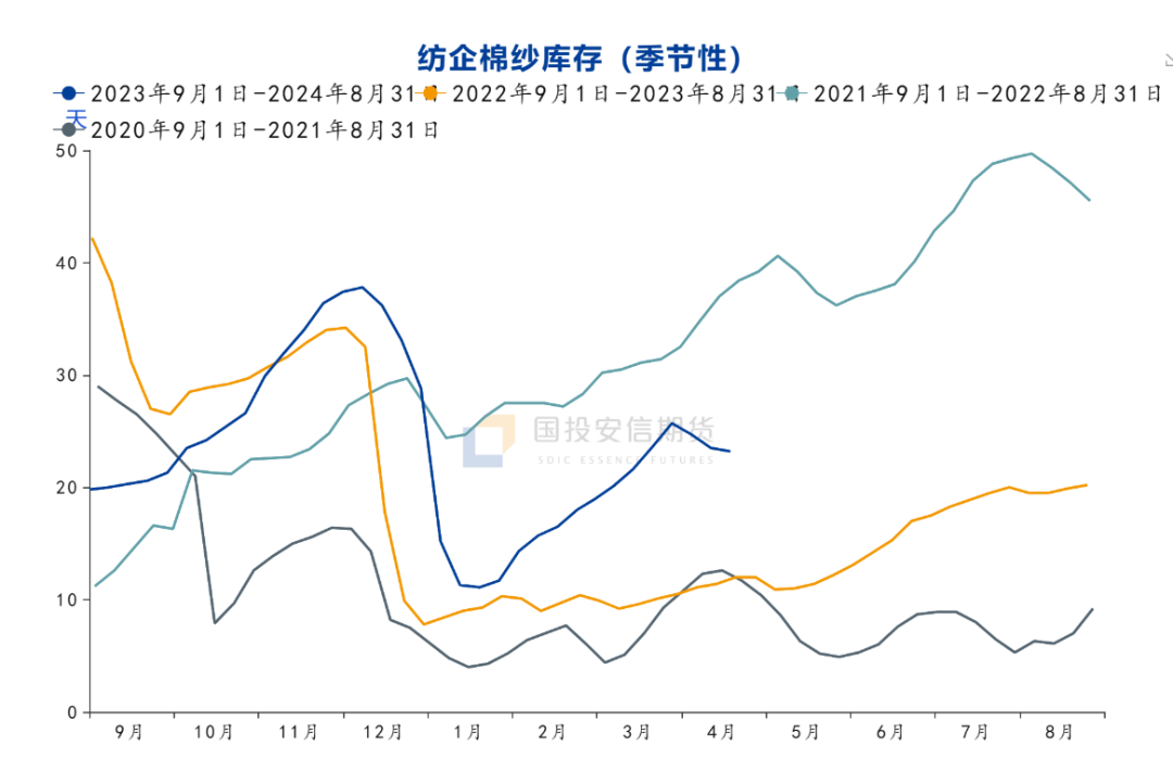 国内金三银四旺季需求表现一般,需求在3月底略有好转,但跟往年的旺季仍有差距,而且内地的纱厂已经亏损了好长一段时间;纱厂的棉纱库存在近期有所回落,但仍高于去年,棉纱的社会库存仍然偏高,产业的矛盾仍然较大。国内纺织产能较大,对于棉花需求有较强的托底作用,因此上游棉花的定价权强于下游。下游棉纱加工持续亏损的情况,从长期看仍需要解决的方法,要么需求好转带动下游产品价格回升,从而修复利润;要么通过棉花价格的下跌,降低原料成本,修复产业的利润。从目前看,金三银四过去之后,下游进入传统的淡季时间,下游有降开机的风险。目前下游棉纱的库存高于去年,且棉纱加工处于持续亏损的状态,需求表现同样弱于去年,五一之后的淡季,下游压力或有所增加。