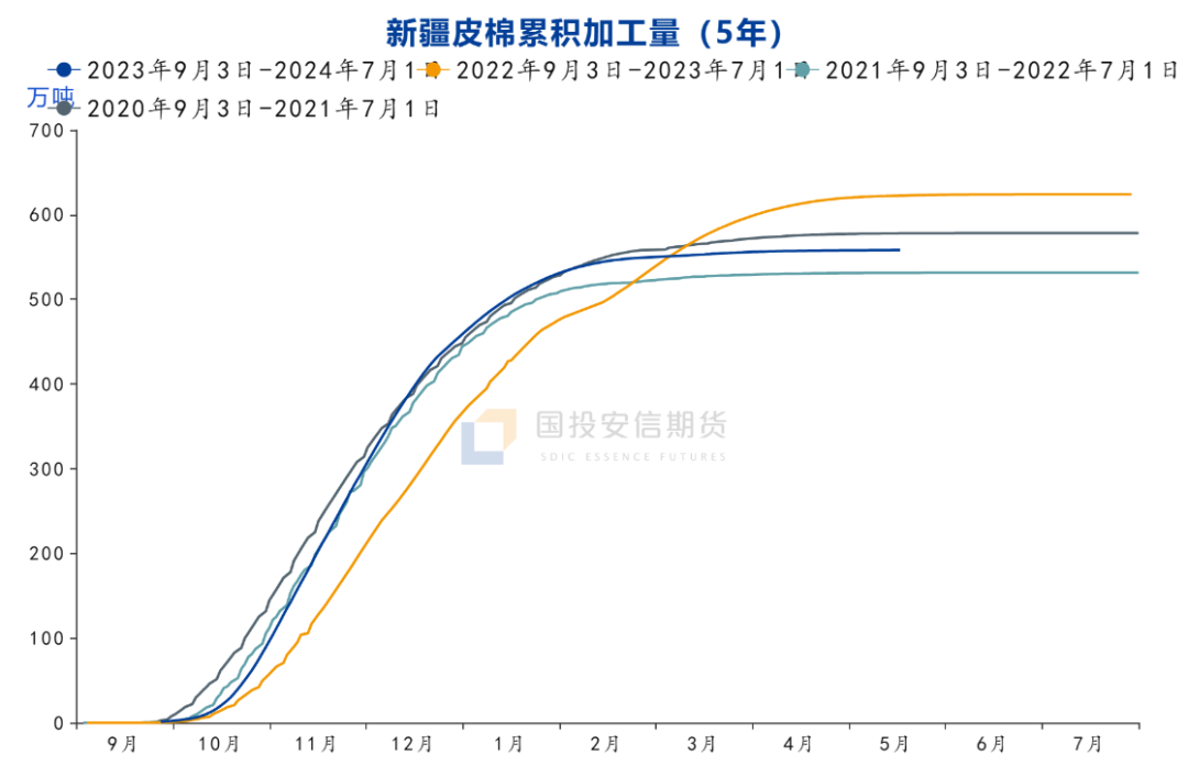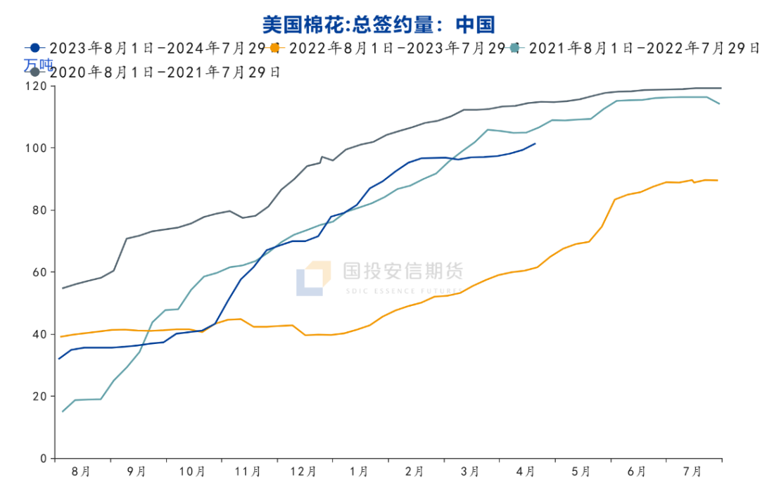 国内23/24年度棉花加工已经处于尾声,截止到2024年4月24日,新疆地区皮棉累计加工总量558.22万吨,同比减幅10.31%,预计新疆的最终产量在560万吨左右。对于新年度种植,市场普遍的预期认为,新疆或者全国的棉花种植面积继续小幅减少,国家棉花市场监测系统于2024年3月中下旬展开全国范围棉花种植意向调查,调查结果显示,2024年中国棉花意向种植面积4049.9万亩,同比减少90.3万亩,减幅2.2%,其中,新疆棉花意向种植面积为3541.3万亩,同比小幅减少75万亩,减幅2.1%。过去两个作物年度新疆的棉花单产均处于偏高的位置,尤其是2023年,虽然新疆种植初期连续遭遇低温大风天气,部分地区多次重播,考虑到去年种植面积的减少,单产仍处于偏高的位置。2024年新疆开始种植,截至目前总体天气情况尚可,虽然政策继续倡导减少棉花的种植面积,但对于棉农来说,棉花种植的技术更成熟且收益稳定(有目标价格政策),这是大多数农作物无法提供的优势。市场对于种植期间天气仍比较敏感,持续关注新疆的天气情况。截至4月底,新疆棉花种植进度已经在90%左右,南疆的种植进度更快,北疆和东疆因气温偏低和大风影响,种植进度偏慢,但总体仍然大幅好于去年。新疆棉花种植的极端天气大多在4月份,如果4月份无大的灾害,进入到5月份之后气温会相对稳定一些。