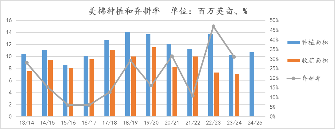 美棉24/25年度大概率要增产,但具体增长幅度仍要跟踪,一方面21/22和22/23年度美棉在生长过程中遭遇了严重天气问题,导致弃耕率在历史高位,从目前来看美棉种植初期天气状况总体偏理想,3月种植意向报告显示种植面积有一定的增加,但幅度不大,USDA 3月种植意向报告,预计2024年美国棉花种植面积估计为1067.3万英亩,同比增加4.3%;其中陆地棉面积估计为1047万英亩,同比增加4%,美国皮马棉种植面积估计为20.3万英亩,同比增加38%。