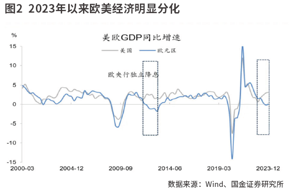 欧美经济增速的分化短期或难以收敛,3月欧央行下调2024年欧元区GDP预测至0.6%,同月,美联储则上调了美国2024年GDP预测至2.1%。上一轮美欧增速明显分化出现在2011-2013年欧债危机期间,欧元区经济大幅下挫,为应对衰退,欧央行独立进行了降息操作。