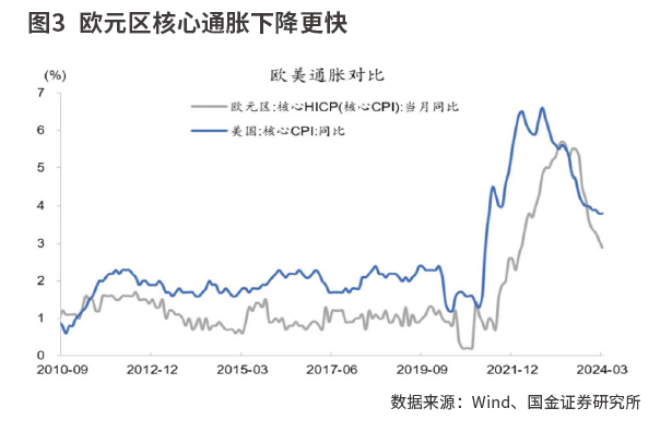 欧元区通胀下行相对顺畅,通胀粘性低于美国。年初以来,美国CPI下行受阻,由年初的3.1%反弹至3月的3.5%,核心CPI连续半年处于4%左右。欧元区通胀在2023年12月曾出现短暂反弹,但截至3月仍延续下降趋势,欧元区核心通胀虽晚于美国达峰,但下降速度更快,3月已降至2.9%,低于美国的3.8%。