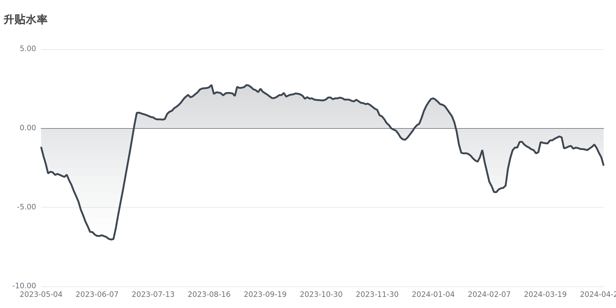 今日该指标值为-2.36%,目前该指标处于近一年较低区间,说明投资者对认为A股市场趋于触底反弹。反映期货市场投资者对市场的看法,该指标越高说明投资者认为当前市场较强,越低则说明认为市场相对较弱,因而与上证指数正相关。