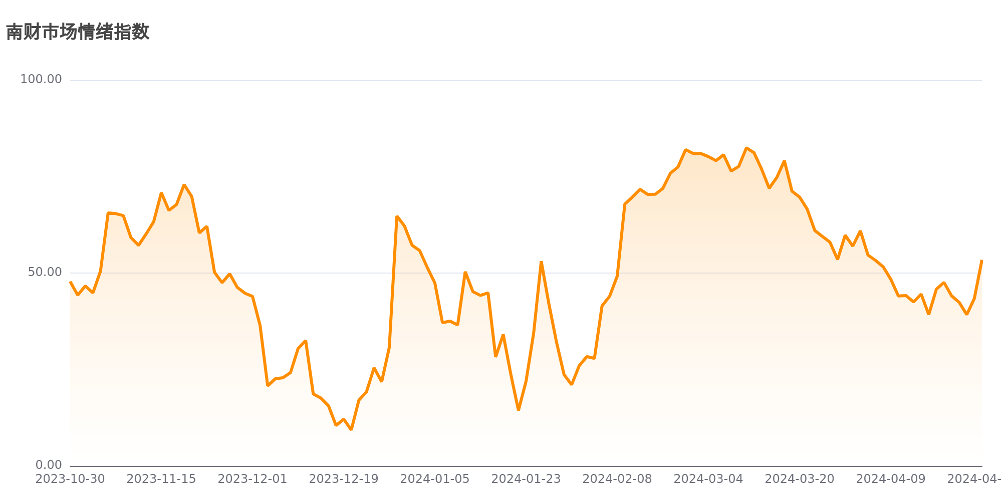 今日南财市场情绪指数为53.4,较前一交易日43.4大幅上涨,市场投资热度明显提升。