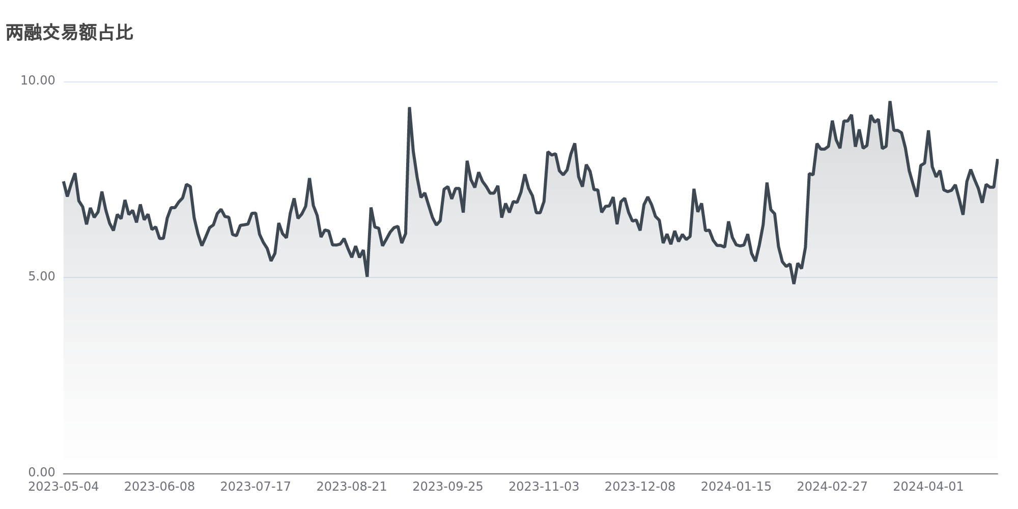 今日该指标值为8.02%,目前该指标处于近一年较高区间,认为当前A股市场相对较强。反映场内投资者借钱炒股的杠杆水平,该指标越高说明杠杆水平越高,即投资者认为当前市场较强,反之则说明投资者认为市场相对较弱,因而与上证指数存在较强的正相关性。