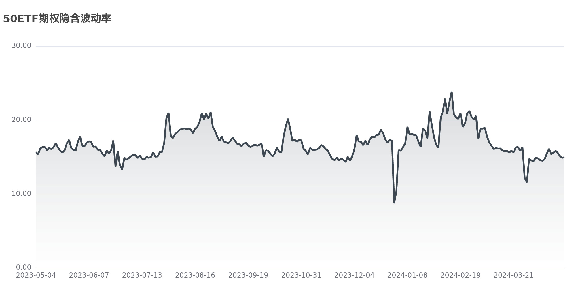 今日该指标值为14.96,目前该指标处于近一年较低区间,说明投资者认为未来市场波动处于较低水平。50ETF期权波动率(原中国波指iVIX,也称作恐慌指数),指数与上证指数存在负相关性,但不绝对。指数点位越高,代表投资者预期后市波动程度愈加激烈;指数点位越低,代表预期后市的走势愈加平稳。VIX在剧烈波动处有聚集的特征,而这些波动聚集处通常是在市场剧烈波动,或指数的低点和高位处。那么,在股指高位处的 VIX 聚拢高企意味着市场风险的集中;而股指快速下跌处的 VIX 高企意味着市场风险的释放。若VIX指数在股市快速下跌时持续的高企并突破极值,这可能预示市场的重大转折——风险已经释放到极致,股市将开始企稳并上扬。