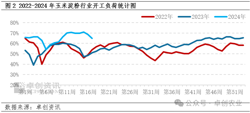 4月玉米淀粉行业月均开工负荷为68.59%,较上月上涨1.42个百分点,较去年同期上涨18.11个百分点。4月国内玉米淀粉行业开工率呈现先增后降的走势,拐点出现在4月中旬。中旬之前由于行业加工利润尚可且原料玉米供给充裕稳定,多数企业保持正常开机生产,未出现停产减产的情况,行业供给压力维持在高位运行。中旬之后随着潮粮加工期的结束以及季节性电厂检修的到来,玉米淀粉行业开工率高位回落,行业供给压力逐步缓和。