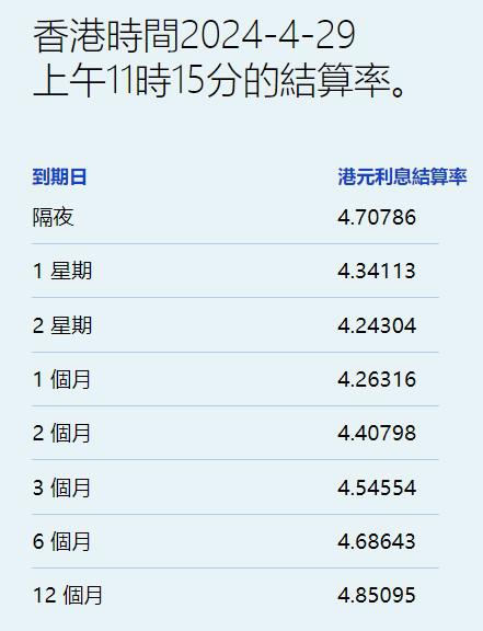 4月29日,港元拆息连续两日全线上扬,其中,隔夜息急升82基点,高见4.70786%,为3月28日以来最高,与楼按相关的一个月拆息三连升,报4.26316%,创近两周新高。