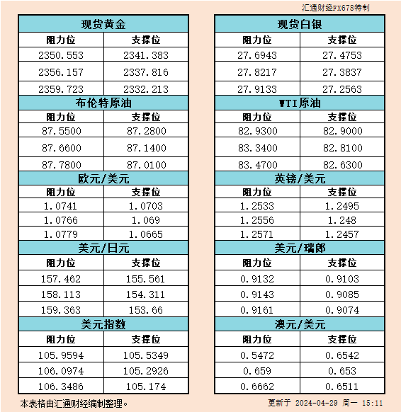 汇通财经APP讯——本文提供黄金、白银、原油、美元指数、欧元、英镑、日元、瑞郎、澳元支撑阻力位。