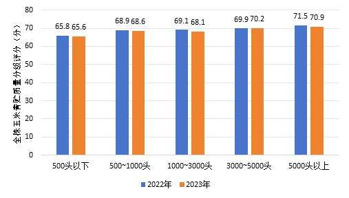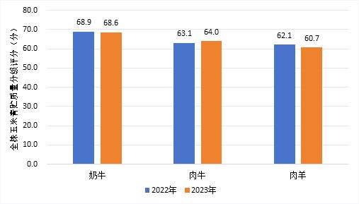 《报告》显示,2023年,我国粮改饲区域全株玉米青贮质量84%达到三级及以上水平,其中21.4%达一级水平,同比提高3.8个百分点;全株玉米青贮质量分级评分指数平均值为66.0分,同比提高0.3%。其中,干物质、淀粉和乳酸含量同比显著提高,分别提高了4.1%、4.4%和9.3%。全株玉米青贮质量在不同地域和草食动物畜种之间仍存在明显差距,黄淮海地区CSQS比西南地区和华南地区分别高11.1%和17.5%,奶牛养殖企业CSQS比肉牛和肉羊养殖企业分别高7.2%和13.0%。