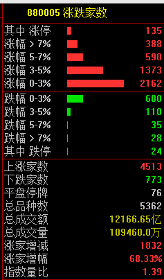 市场共4513只个股上涨,135只个股涨停,773只个股下跌。