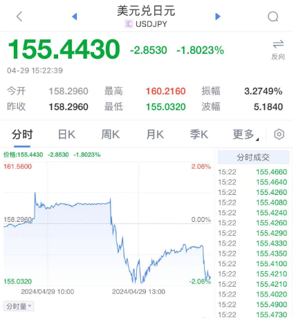 当日元触及160关口的时候,上演了惊天逆转,迅速回升至约1美元兑155日元的水平。
