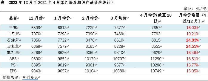 2024年1-4月份,苯乙烯及相关产品多呈现连续走高趋势,如下表所示,其中苯乙烯上游石油苯和加氢苯价格涨幅分别达到24.93%及24.55%,超过苯乙烯16.46%的涨幅,也大于下游三S的涨幅。石油苯与加氢苯涨幅较大,主要是1-4月纯苯因为进口套利窗口迟迟未打开,主港库存整体偏低,供需结构向好支撑涨幅大于下游产品。同时,五一节前的时间节点来看,因为5月纯苯有供需结构显著改善的预期(需求增量远大于供应增量),将对价格形成显著提振,所以节前市场备货氛围强于较去年同期。