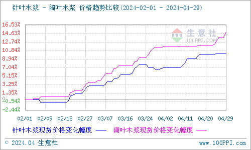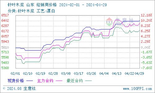 据生意社商品行情分析系统监测:4月针叶木浆和阔叶木浆价格持续强势上行。4月29日针叶木浆山东地区市场均价为6400元/吨,与4月1日均价6210元/吨相比上涨了3.06%。4月29日阔叶木浆山东地区市场均价为5860元/吨,与4月1日均价5690元/吨相比上涨了2.99%。