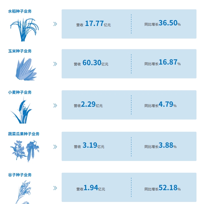 年报显示,隆平高科水稻种子实现营收17.77亿元,同比增长36.50%,市场占有率18%,位列国内第一;国内玉米种子营收22.68亿元,同比增长72.30%,市场占有率由7%提高至近10%,稳居国内第一;隆平高科谷子、食葵、辣椒、黄瓜种子市场份额分别为60%、39%、10%、60%。