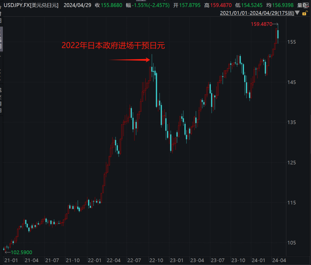 周一,日元出现大幅波动。在亚洲交易时段,美元兑日元一度接近160的34年新高。据消息人士称,日本金融当局干预了外汇市场。日本政府曾在2022年进场干预日元走势。