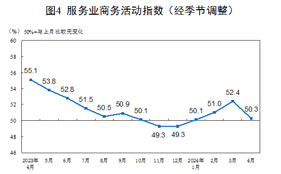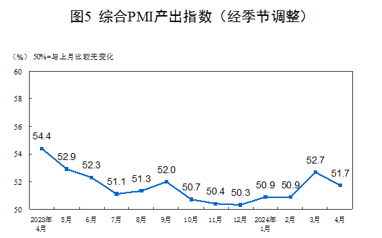 4月份,综合PMI产出指数为51.7%,比上月下降1.0个百分点,继续高于临界点,表明我国企业生产经营活动持续扩张。