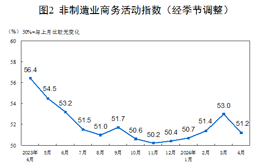 4月份,非制造业商务活动指数为51.2%,比上月下降1.8个百分点,仍高于临界点,表明非制造业延续扩张态势。