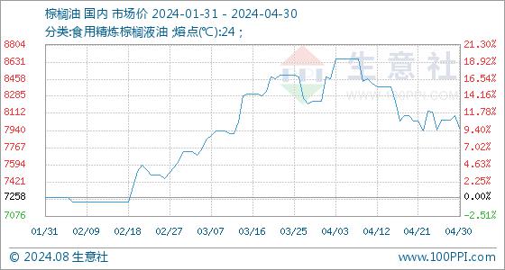 4月30日,生意社棕榈油基准价为8088.00元/吨,与本月初(8240.00元/吨)相比,下降了-1.84%。
