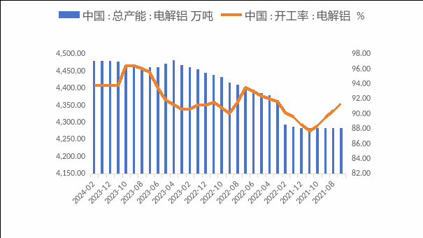图9:中国电解铝产能及开工率 图10:国内铝锭社库