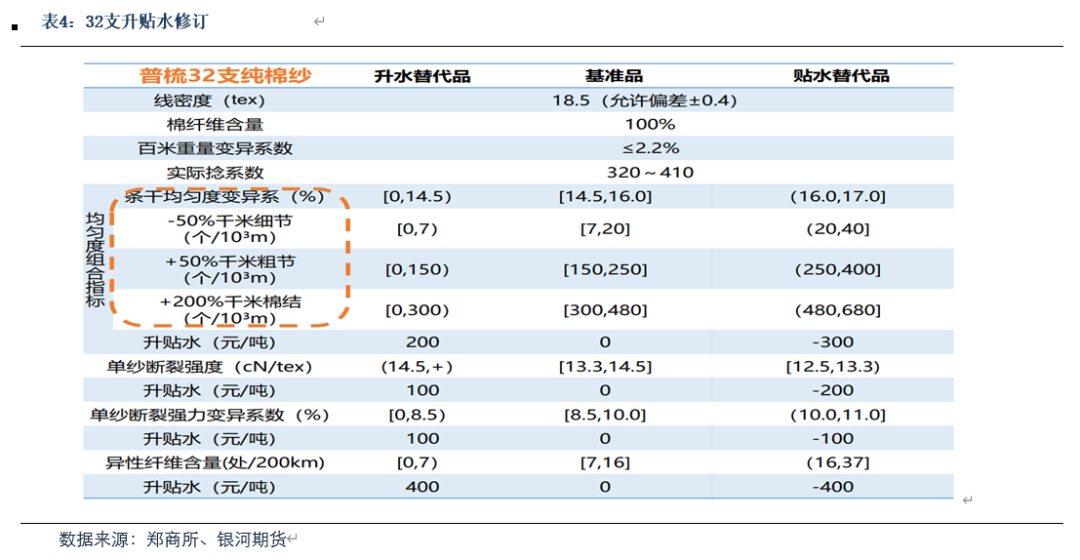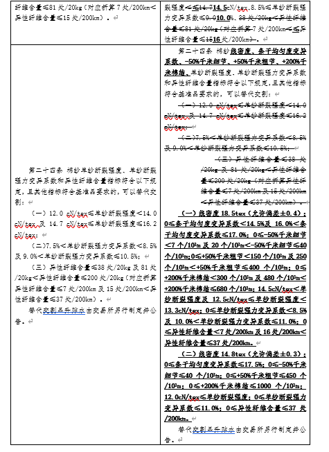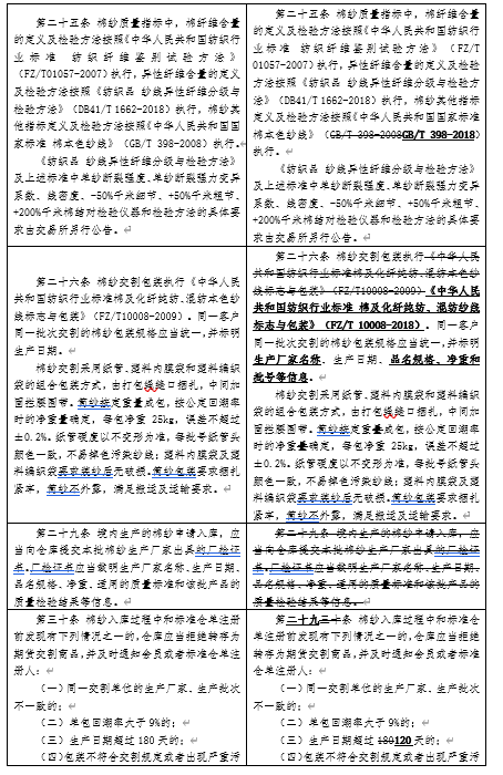 修订后仍然以32支为基准交割品,但是对线密度、捻系数方面做出了调整,一定程度上保证接货后结合其他的各项指标基本确保了交割纱线可以达到针机两用。
