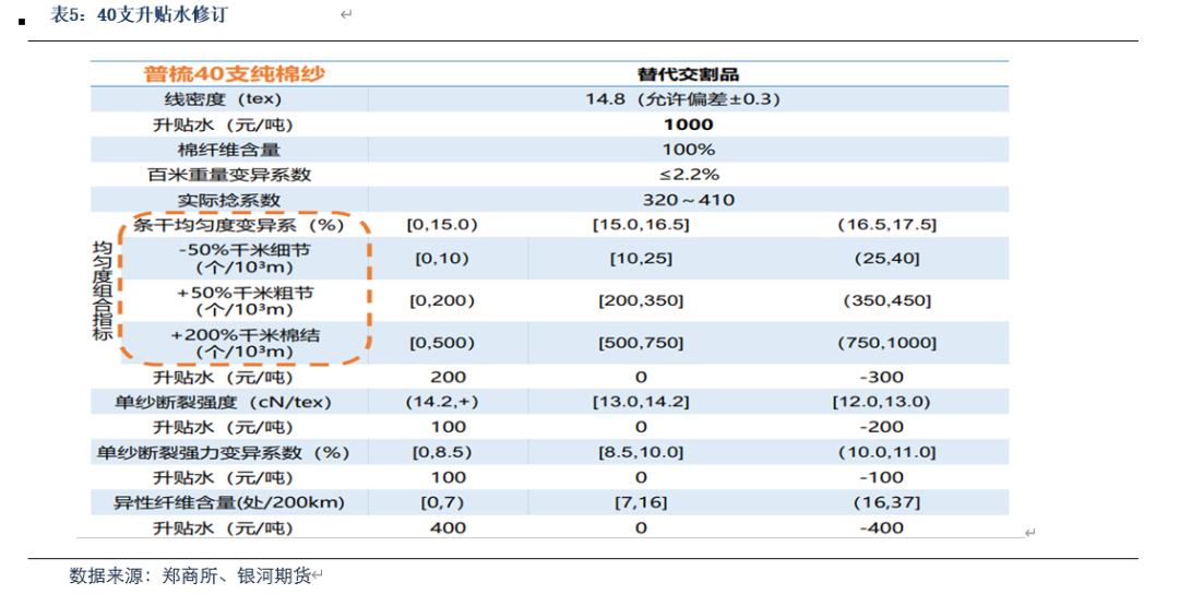 综合来看,32支的升水大概控制在800升水、1000贴水范围;替代交割40支,质量指标以32支为基准,线密度这里做出了升贴水,只要是40支纱将提供1000的升水,主要原因是市场大多数情况40支纱与32支纱直接有1000左右的价差,因此替代交割只要是40支纱就会有支数上的升水,而质量指标升贴水逻辑与32支设定基本一致。