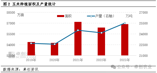 由图1可以看出,2023年新粮上市以来的下跌行情为2020年以来下跌维持时间最长、累计下跌幅度最大的调整期。出现这种情况的主要原因在于供大于求格局难以明显转变,一方面2023/2024年度玉米丰产明显,据卓创资讯监测数据显示,2023/2024年度全国玉米种植面积同比上一年度增加500万亩左右,预计达到56880万亩;玉米产量预计同比增加1320万吨,总产量达到25500万吨。