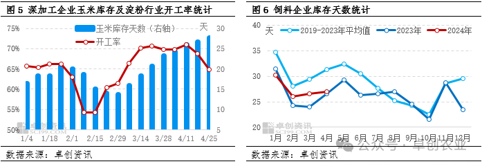 截至4月25日,淀粉行业开工负荷降至64.81%,已连续下降2周,因行业库存压力较大,库存处于近几年最高水平,且行业盈利情况欠佳,部分企业为缓解亏损及销售压力,部分企业选择停产或检修,使得行业开工率下滑。后期随着市场竞争压力增加,中小型企业停产或者减产将逐步增多,行业开工率或继续下降。同时,截至4月25日,卓创资讯监测深加工企业平均库存天数为27.7天,同比增3.88%,企业玉米原料库存相对充足。在行业开工率下降的情况下,深加工企业玉米消耗量将减少,同时库存高位,对玉米的采购量或减少。