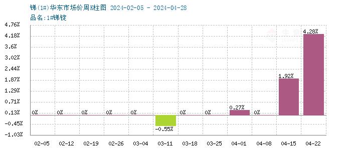 商品价格K柱图,运用价格走势K线的理念,以柱状图形式,反映每周或者每月的价格涨跌变化,投资者可以根据K柱图的变化,来进行买卖投资。红色表示:上涨;绿色表示:下跌;K柱高度表示:涨跌幅度。从上图可以看出锑锭市场进入24年以来整体上行,其中1月涨幅较大在11.69%,4月涨幅再9.34%。周度K柱图可以看出锑锭市场前期保持暂稳运行,进入4月中旬后价格连续上行。