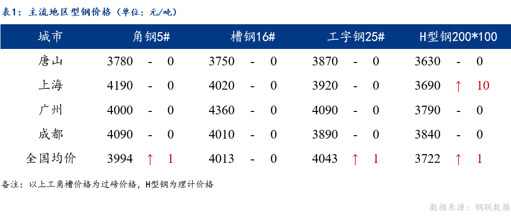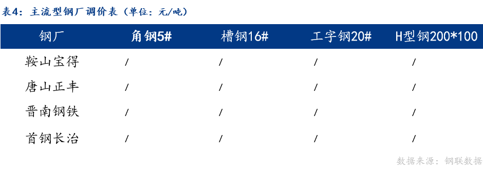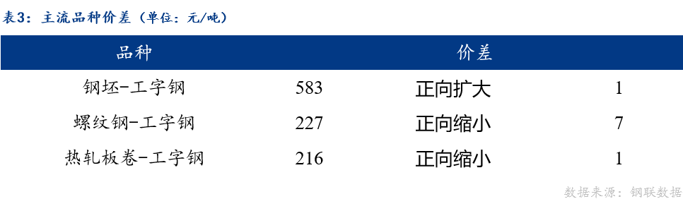 从品种价差来看,唐山工字钢与钢坯价差正向扩大,与螺纹钢、热轧板卷价差正向缩小。
