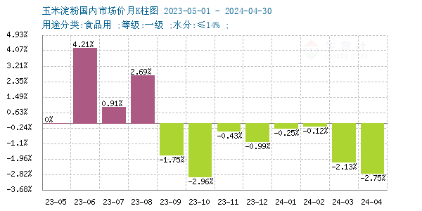 据生意社商品行情分析系统,2024年4月国内玉米淀粉价格持续弱势下行,4月1日食用一级玉米淀粉均价为3128.00元/吨,4月30日均价为3042.00元/吨,月内下跌2.75%。