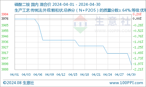 据生意社商品行情分析系统,4月30日国内64%二铵市场均价是3916元/吨,4月1日国内64%二铵市场均价是3976元/吨,本周磷酸二铵市场价格下跌1.51%。