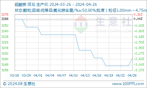 据生意社商品行情分析系统监测:本月初硫酸钾含量50%价格为3250元/吨,本月末硫酸钾含量50%价格为3176元/吨,价格下跌2.26%。