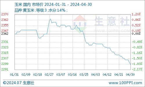 据生意社商品行情分析系统,2024年4月国内玉米价格持续偏弱运行,4月1日3等黄玉米均价为2330.00元/吨,4月30日均价为2298.37元/吨,月内下跌1.35%。