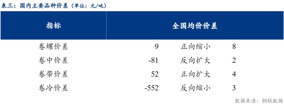 从品种价差来看,卷螺差较上一交易日正向缩小8元/吨,热中价差较上一交易日反向扩大2元/吨,热带价差较上一交易日正向扩大4元/吨,热冷价差较上一交易日反向缩小3元/吨。