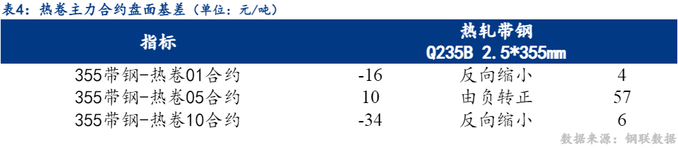 30日市场热卷05合约与355带钢价差由负转正为57元/吨,热卷10合约与355带钢价差反向缩小6元/吨。