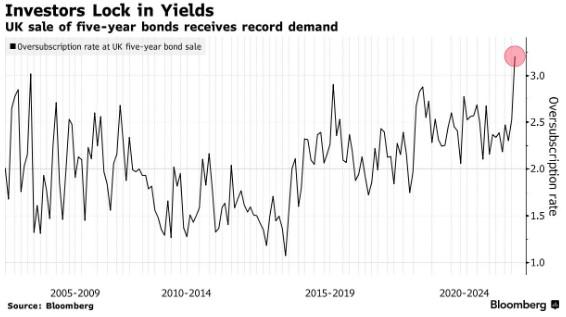 英国政府债券(金边债券)拍卖的超额认购创下纪录,数月来最高的收益率再次吸引了买家,缓解了市场对债券发行过剩将削弱购买欲望的担忧。英国债务管理办公室(Debt Management Office)周二在拍卖40亿英镑的五年期债券时收到了128亿英镑(160亿美元)的订单,使投标与成交比率达到3.21的历史新高。