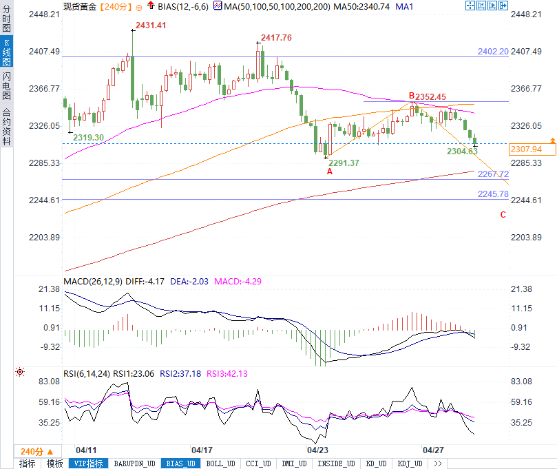 在4小时走势图上,黄金价格似乎正进入其衡量移动模式的最终下跌阶段,这一模式对于技术分析短期市场动向至关重要。