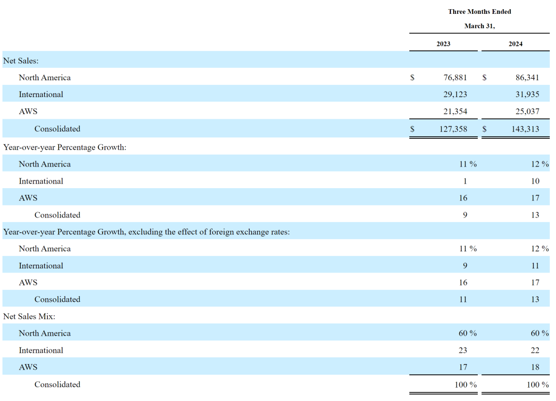 美东时间5月1日,亚马逊公布的一季报显示,2024年第一季度亚马逊净销售额增长13%至1433亿美元。其中北美分部销售额同比增长12%至863亿美元,国际业务销售额同比增长10%至319亿美元。亚马逊的核心业务亚马逊云(AWS)在第一季度实现了250亿美元的净销售额,同比增长17%,恢复了增速,去年第三季度12%的增速是亚马逊云计算业务自2014年以来的最低增速。