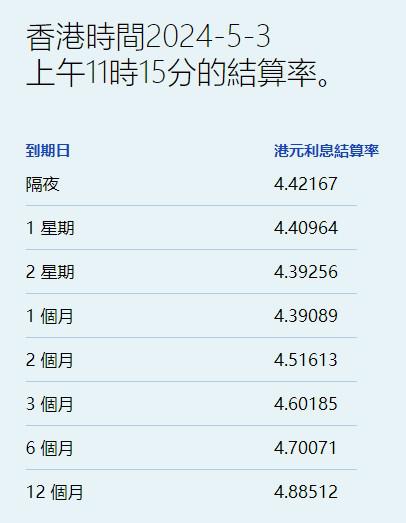 5月3日,港元拆息普遍向上,与楼按相关的一个月拆息报4.39089%,升4.994基点,连升6日,创近一个月高位;反映银行资金成本的三个月拆息报4.60185%,升1.852基点。