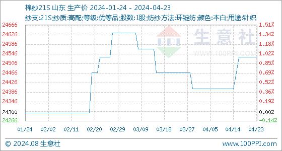 4月23日,生意社棉纱21S基准价为24533.33元/吨,与本月初(24400.00元/吨)相比,上涨了0.55%。