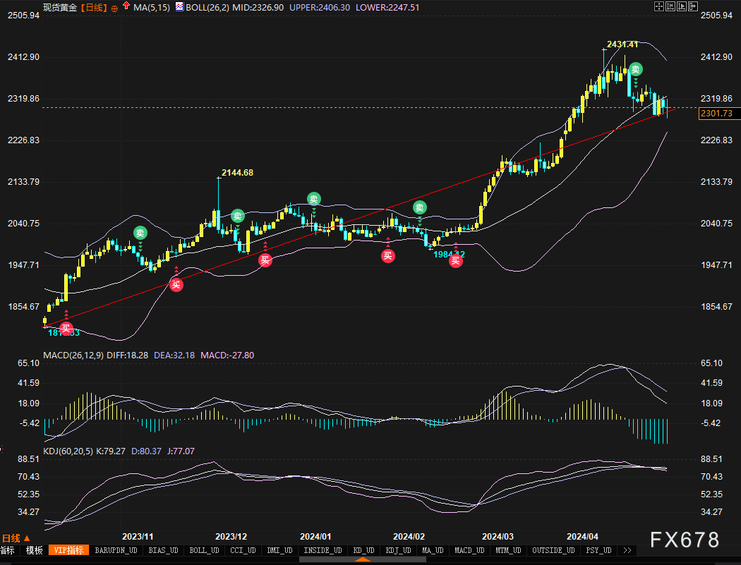 现货黄金日图连续四天守住了2290附近的支撑,在上周五(5月3日)非农后的行情一波三折,冲高逾20美元后又大跌近45美元,非农后的那个急跌也只是短暂刺破2290但迅速得到买盘支撑。日图级别出现类似看涨孕线信号,上周五收盘于2301.73美元/盎司。
