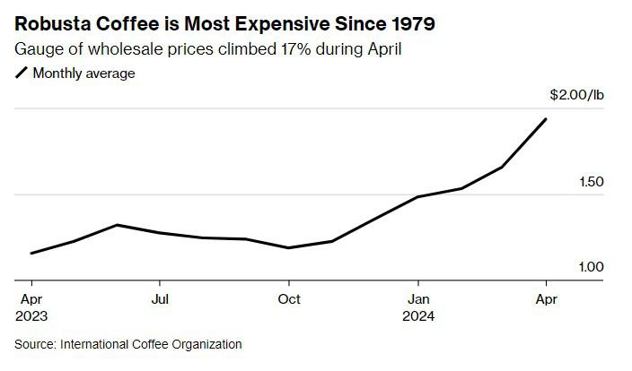 根据国际咖啡组织(International Coffee Organization,ICO)的数据显示,由于用于浓缩咖啡和速溶饮料的咖啡豆品种供应紧张加剧,罗布斯塔咖啡豆的价格已攀升至45年来的最高水平。