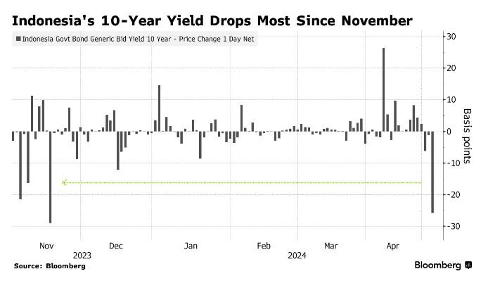 印尼债券收益率创下去年11月以来的最大跌幅,跑赢亚洲同行,原因是美国降息押注的复苏刺激了对印尼债券的需求。上月,印尼债券遭遇大量抛售。