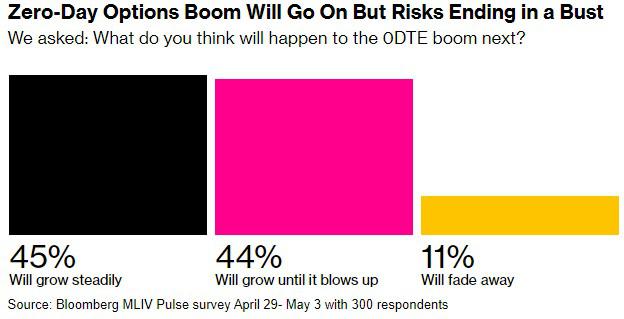 在华尔街对快速到期股票期权的狂热开始两年后,最新的Markets Live Pulse调查显示,这种前所未有的繁荣仍有持续的空间——尽管近一半的受访者担心最终会崩盘。