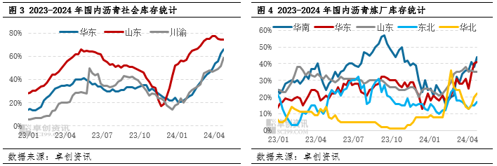从需求端来看,4月份,社会及炼厂沥青库存水平均涨至较高的水平,市场总体需求表现整体欠佳。